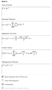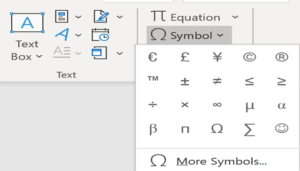 When creating a mathematical document, you may want to include equations in your work. Formulas can be written in word using symbols, click on the “insert” tab on the ribbon and then click ‘symbols’ on the far right. As you click, a drop-down menu will appear. Click on the desired page and you will be able to add various symbols and letters.