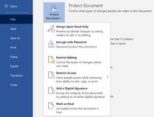 When a document contains sensitive information or you do not want other people to be able to edit it, you can choose to  ‘protect’ the document . In Microsoft Word, you are able to secure word documents in various ways. • Read-Only • Encrypting with password • Restricting editing and access • Adding a digital signature To access this functionality click File > Info > Protect Document