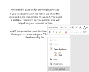In Word, you have the ability to search anything in a document. This means that instead of leaving your document to go to a search engine browser. You are able to highlight anything you need more information on. This is also a great tool to help you to learn new things as you type. To use this, highlight the word and click the right mouse button and choose smart look up. We hope you found this useful, there are many more tips, tricks and shortcuts available on our blog.