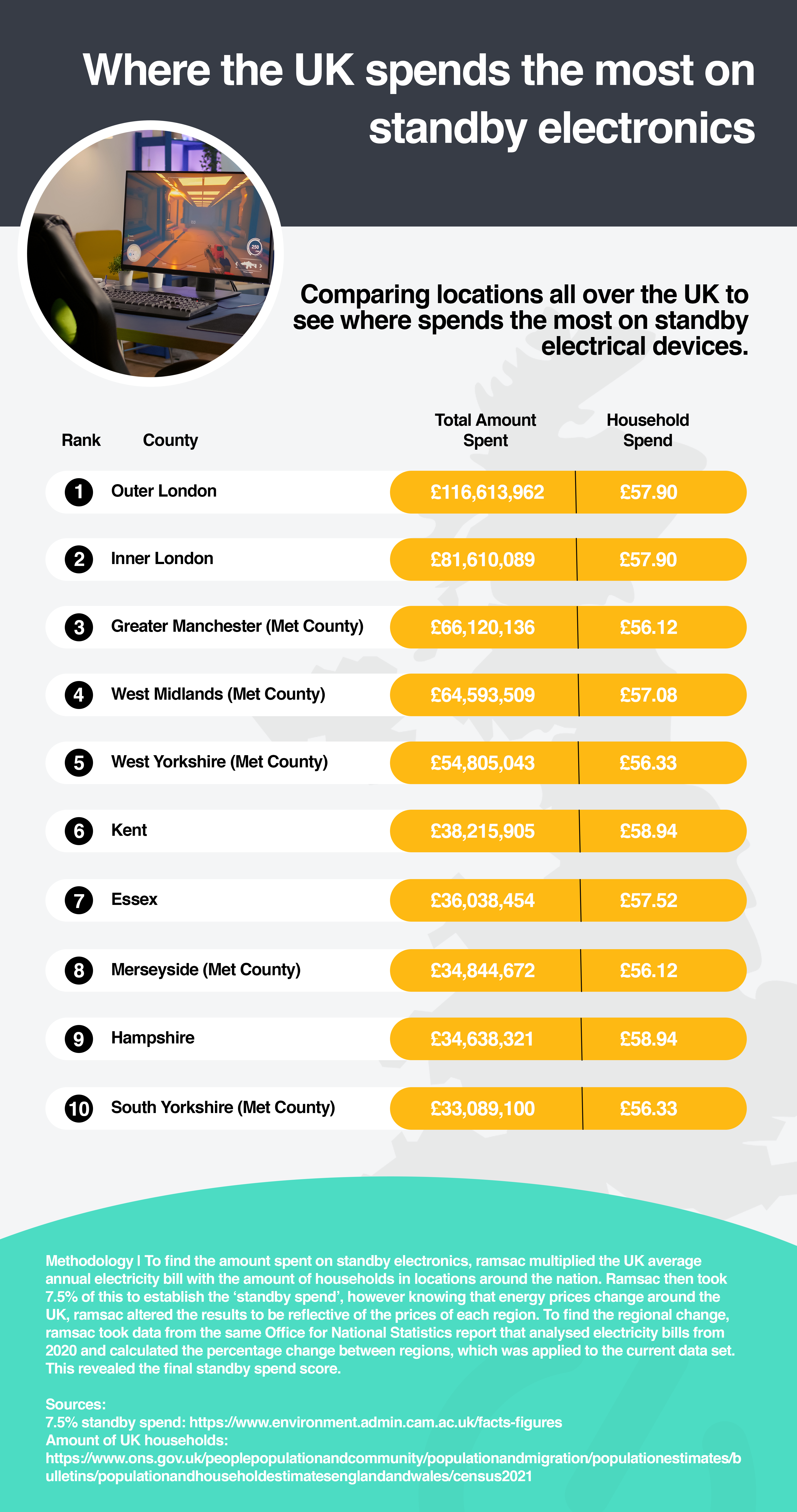 To find the amount spent on standby electronics, ramsac multiplied the UK average annual electricity bill with the number of households in locations around the nation. Ramsac then took 7.5% of this to establish the ‘standby spend’, however knowing that energy prices change around the UK, ramsac altered the results to be reflective of the prices of each region. To find the regional change, ramsac took data from the same Office for National Statistics report that analysed electricity bills from 2020 and calculated the percentage change between regions, which was applied to the current data set. This revealed the final standby spend score.