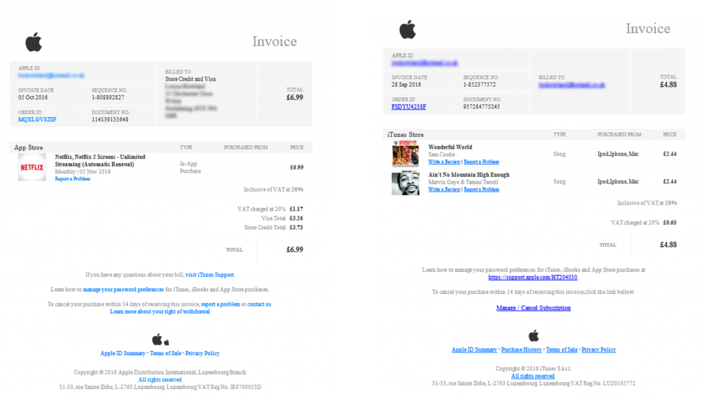 On the real Apple email they list my email address and home address. The phishing email only has my email address – as I assume the hackers don’t know my home address. Spot the different between invoices