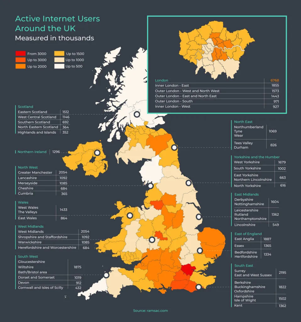 Across the UK, there were over 49 million active internet users. Here’s how each region of the nation compared: