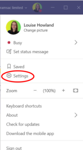 Large Gallery view is an optional feature that can be turned on or off. Here’s how to enable it: 1) First you need to enable the new meeting experience (which as well as giving access to Large gallery view and together mode will open meetings and calls in a new window) 2) Click on your profile and choose ‘settings’