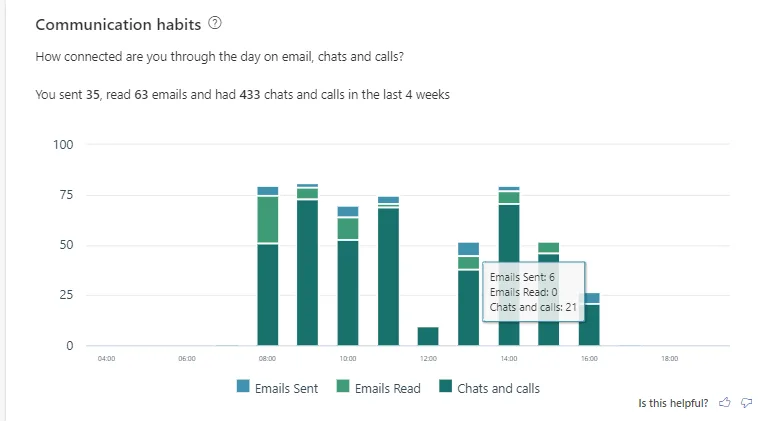 Viva’s communication habits look at what you’ve accomplished in terms of collaboration and collates it into a four-weekly bar chart. This way you can see what you do regularly, and what your habits are at any one point in the day.