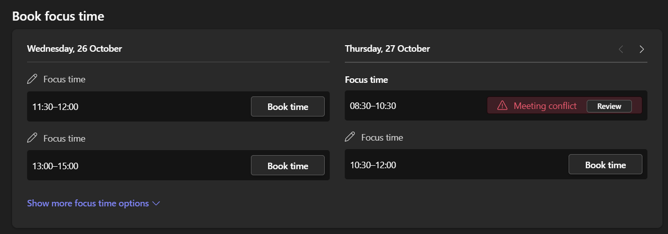Focus time slots are booked up to twice a day and are varying lengths to allow for space between meetings. Then, an automatic ‘Focusing’ status is applied to your Teams status, rather than you needing to set Do Not Disturb. Not only does this encourage your employees to focus solely on one task during that time but it also allows other employees to be more conscious of disturbing people between meetings.