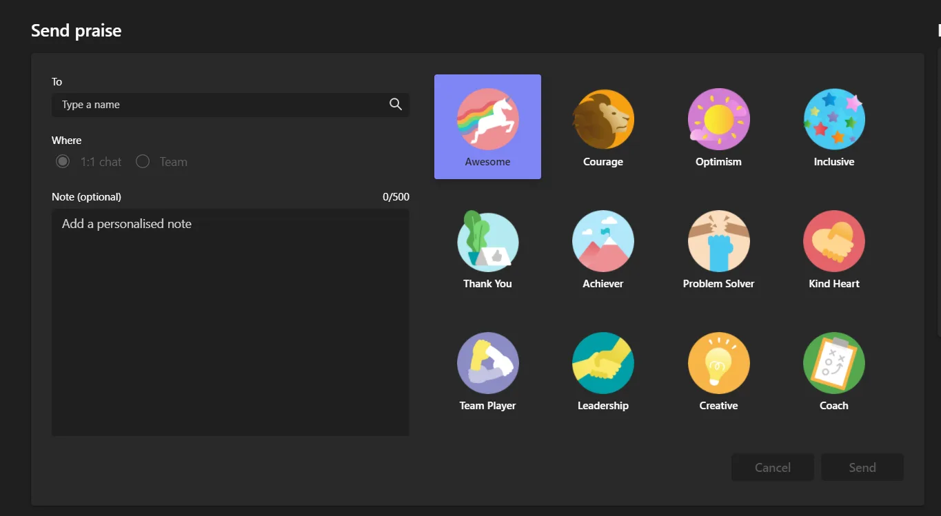 The Praise function in Viva is also embedded into Teams chat. It allows you to send praise to a specific colleague for a variety of reasons, such as inclusivity, team player, leadership and optimism.