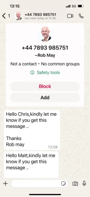 In this instance, a ramsac employee received a message from an unfamiliar mobile number. The profile photo and name were made to resemble Rob May. The message simply read: “Hello Chris, kindly let me know if you get this message… Thanks, Rob May.” Shortly after, another message was sent but this time addressed to “Matt.”