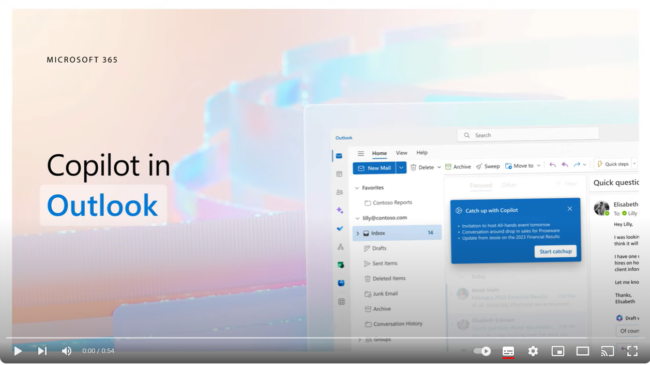 Outlook: Microsoft 365 Copilot can help you manage your email and calendar by suggesting actions, responses, and creating reminders for your messages and events. For example, you can ask Microsoft 365 Copilot to schedule a meeting, reply to an email, or follow up on a task. Watch a video of how Microsoft 365 Copilot can help you organise your inbox.