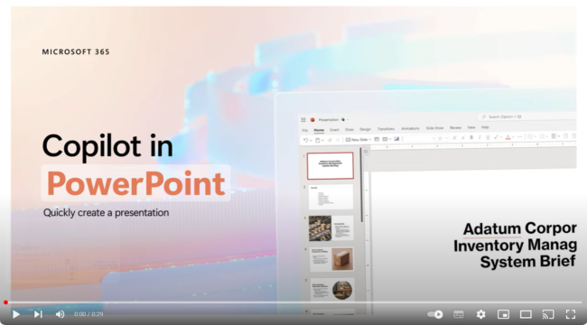 PowerPoint: Microsoft 365 Copilot can help you create engaging and impactful presentations by suggesting design content for your slides. For example, you can ask Microsoft 365 Copilot to add a title, insert an image, or generate bullet points for your topic. Watch a video of how Microsoft 365 Copilot in PowerPoint can take the hassle out of creating presentations.